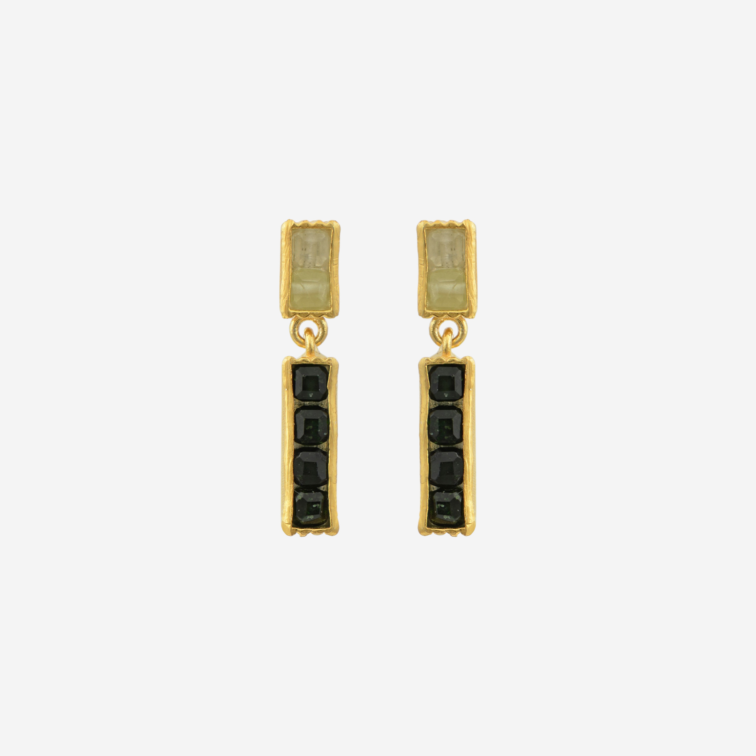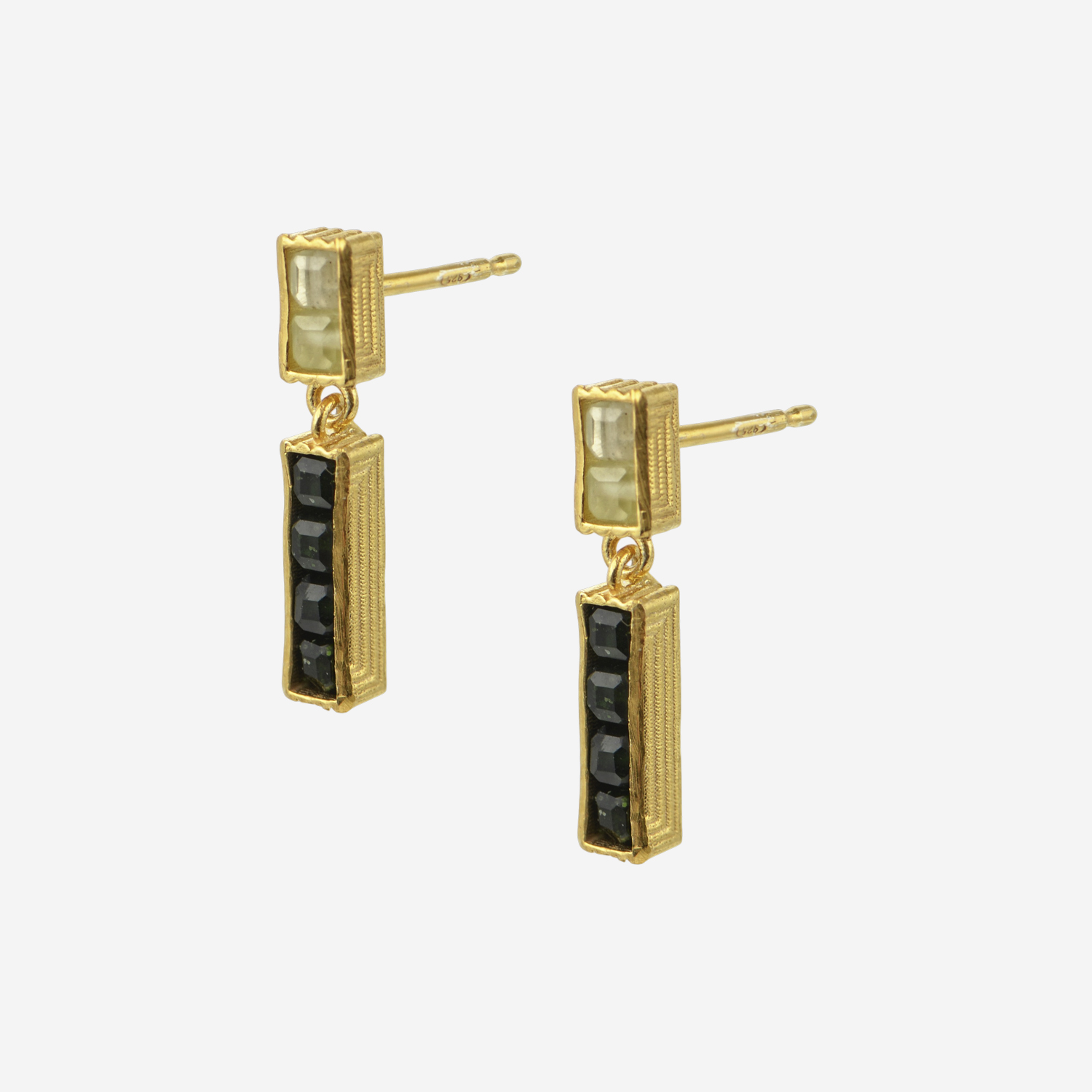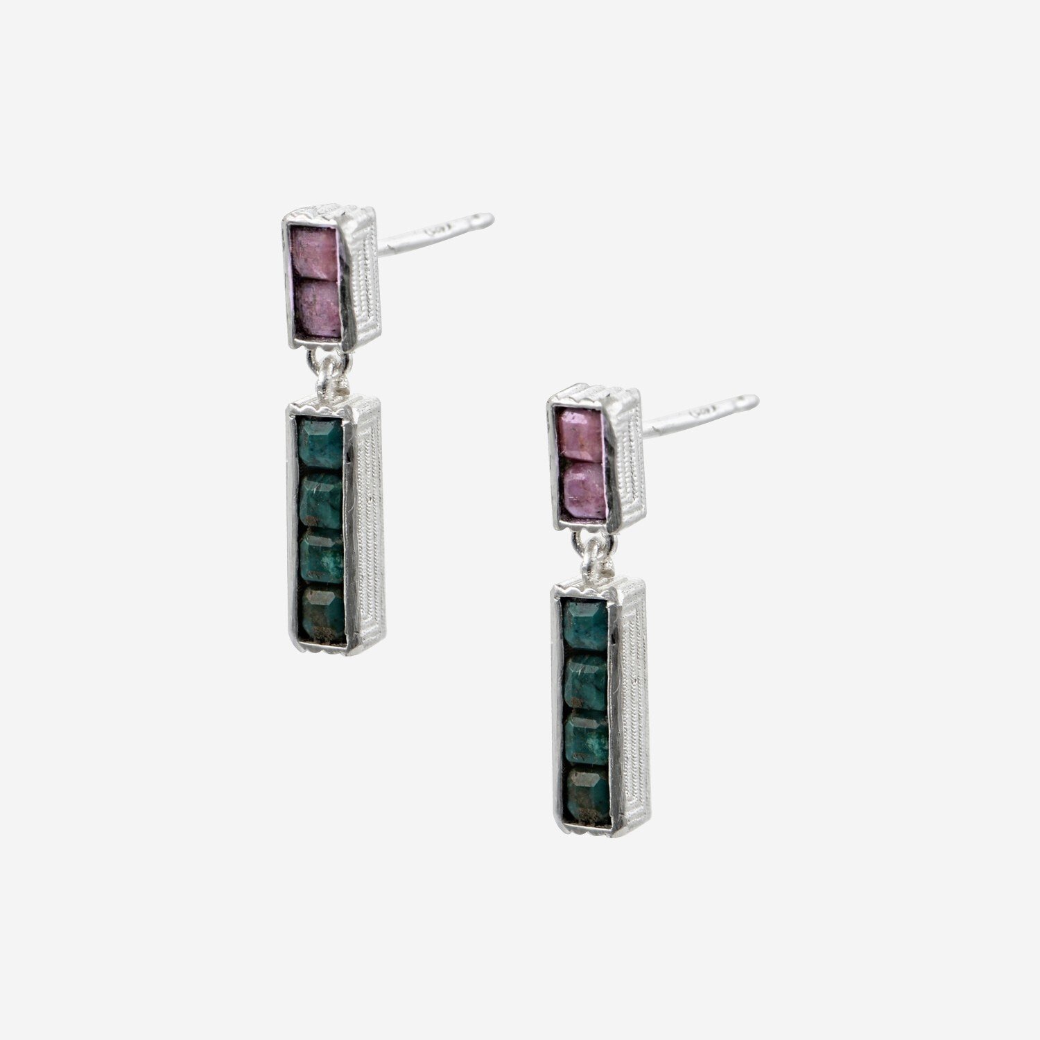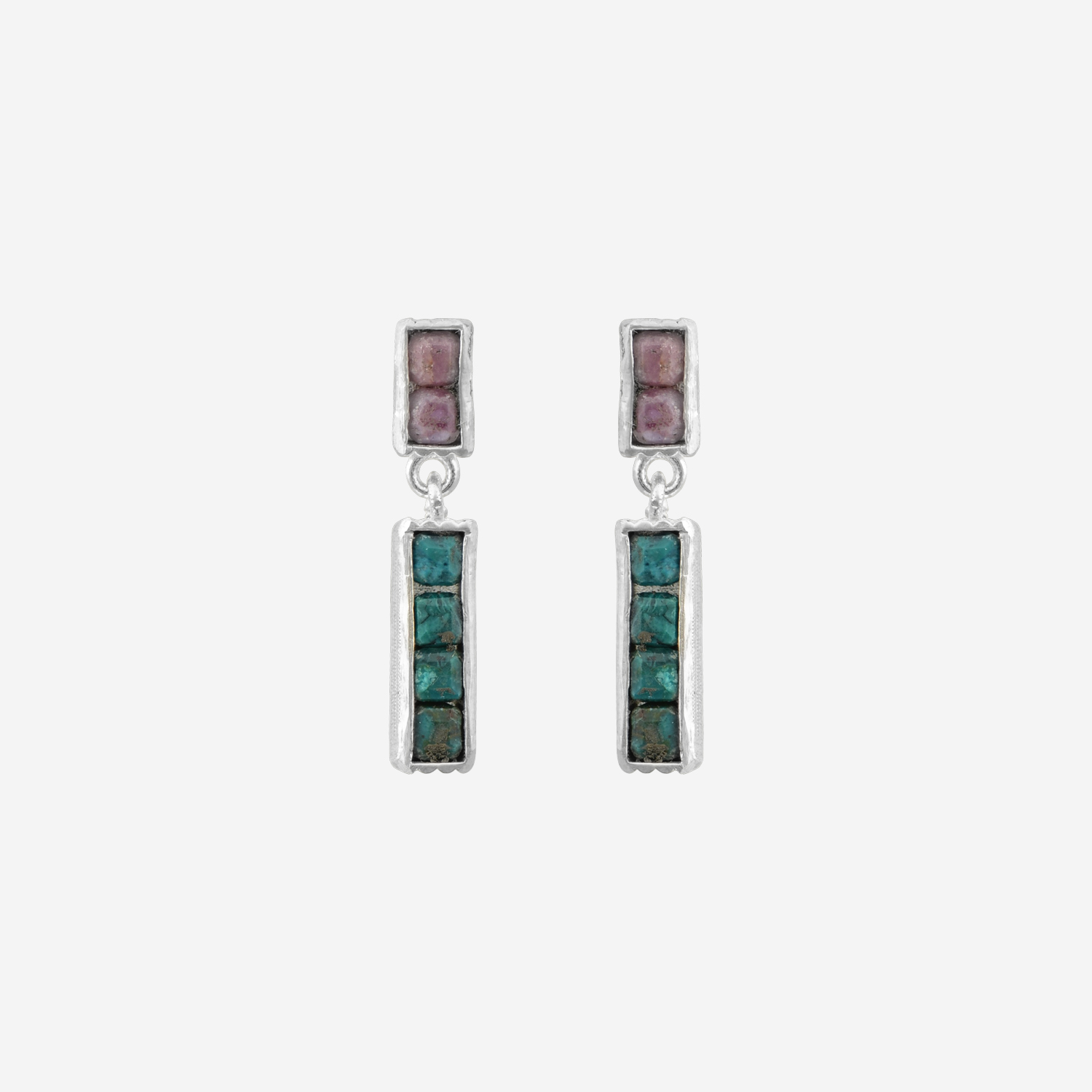 Μέρος της σειράς Tetra, αυτό το χειροποίητο ζευγάρι κρεμαστών σκουλαρικιών ξεχωρίζει για τη μίνιμαλ γεωμετρική του φόρμα και τη διακριτική του κίνηση. Το σχέδιό του, εμπνευσμένο από τις φόρμες του Tetris, συνδυάζει δύο γραμμικά στοιχεία με ημιπολύτιμες πέτρες σε κυβικό σχήμα, ενώ η αντίθεση των δύο διαφορετικών λίθων δημιουργεί ένα σύγχρονο κόσμημα με έντονο χαρακτήρα.
